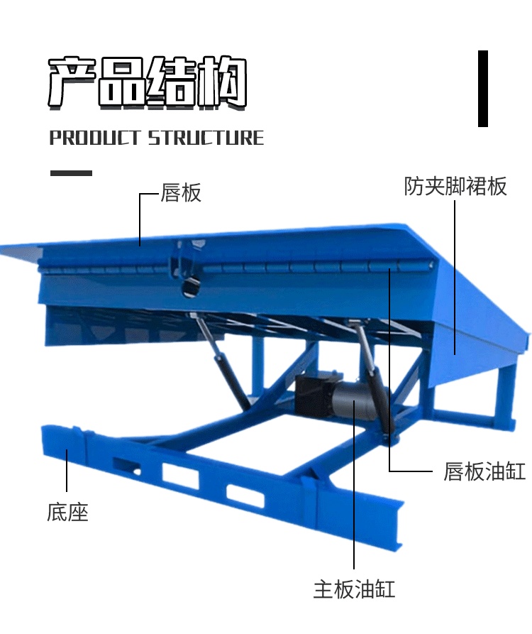 4. 安全防护:防轧脚裙板、防撞橡胶块、安全支撑杆、液压安全锁、与工业门互锁装置;